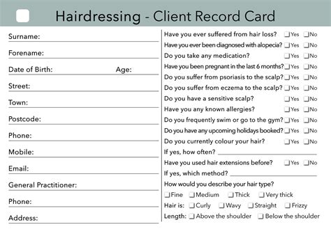 List Of Client Record Cards Hairdressing Template. Check out our hair salon client record cards selection for the very best in unique or custom, handmade pieces from our templates shops. Lots of beauty form pdfs available.