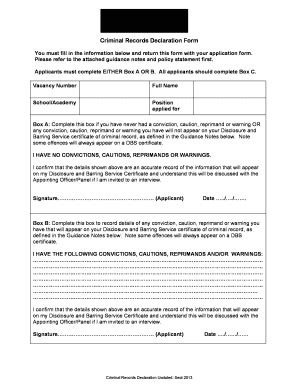 Free Criminal Record Declaration Form Template. Up to $50 cash back criminal record self declaration is a form where individuals are required to disclose any criminal convictions or charges against them. This document is a criminal records declaration form that must be completed by all applicants for a position.