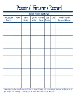 Up to $50 cash back edit personal firearms record template form. Replace text, adding objects, rearranging pages, and more. A complete description of each firearm is vitally important to law enforcement in the investigation and recovery of your firearms and to your ability to prove ownership.